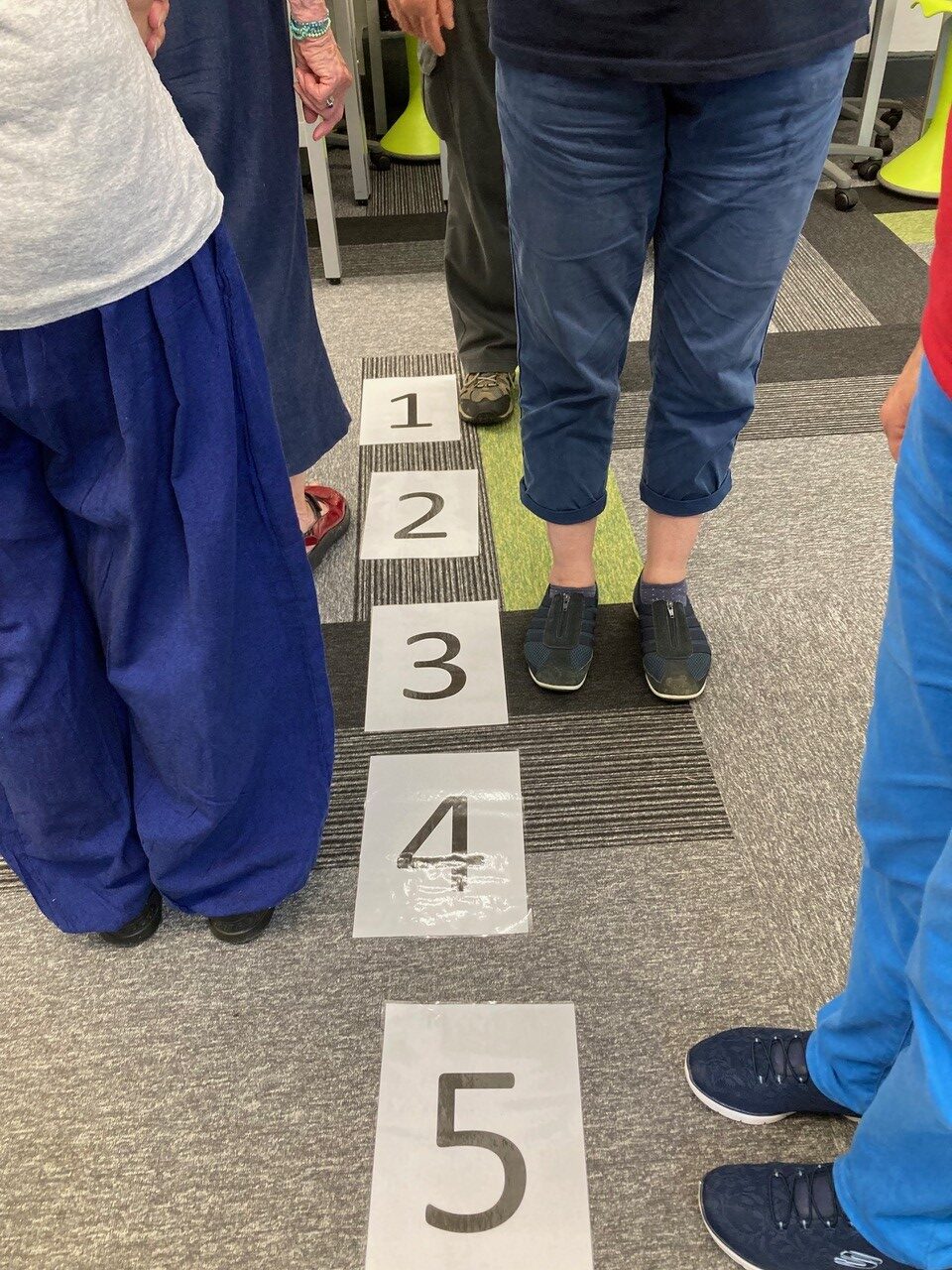 Friday and Saturday followed a similar pattern with 2 practical sessions mid-day and some sort of pub lunch or picnic in between. Either side of the practical sessions were some optional sessions which you could choose yourself. I went to a Listening session, Blue Line Dancing, Rope Control when Raising and Playing with Numbers. Some of these sessions were for my progression and some for me to take back to share with our band. One of these was the Blue Line Dancing. You can see how it starts off from the photo but I found it a really good way to demonstrate a method – we did Bob Doubles – as each time we walked round and noticed Treble in lead I would point out to the lady I was dodging with to look out as the next dodge would also be with me…plus all the other little pointers about Course and After bells. A great laugh was had with a new bunch of ringers.
