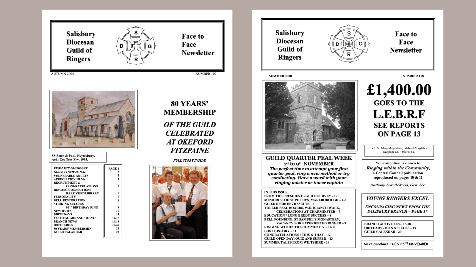 With the sudden death of the Roger Keeley in January 1987, the production of the newsletter was taken up by Ivan Andrews of Bradpole, assisted by Donald Lee of Marlborough (Don continuing to assist through the 90s). In 1992 Face to Face first appeared as a quarterly, 20-page production. In 1997 it was decided to enter copies of Face to Face in The Ringing World Newsletter Competition where the Guild was extremely pleased to attain joint second place.
