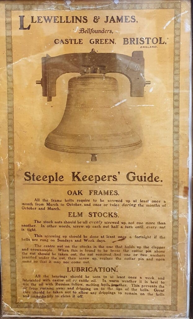 Hanging on the wall of the Bradpole ringing chamber in West Dorset is this fascinating notice from bellfounders Llewellins and James of Bristol who appear to have flourished between 1870 and 1940.  Presumably it was supplied when the bells were rehung in 1911.