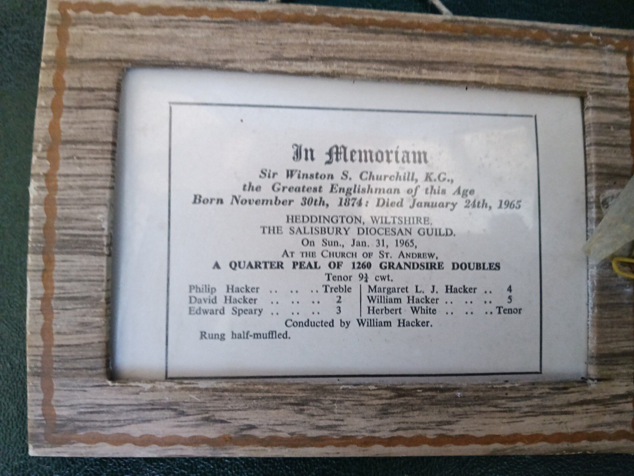 Interestingly, the band on 1st November included Philip Hacker and Edward Spearey who both learnt to ring at Heddington in the early 60’s – in fact there is a small plaque on the wall recording that they rang a quarter peal together on 31st January 1965 for the death of Winston Churchill.