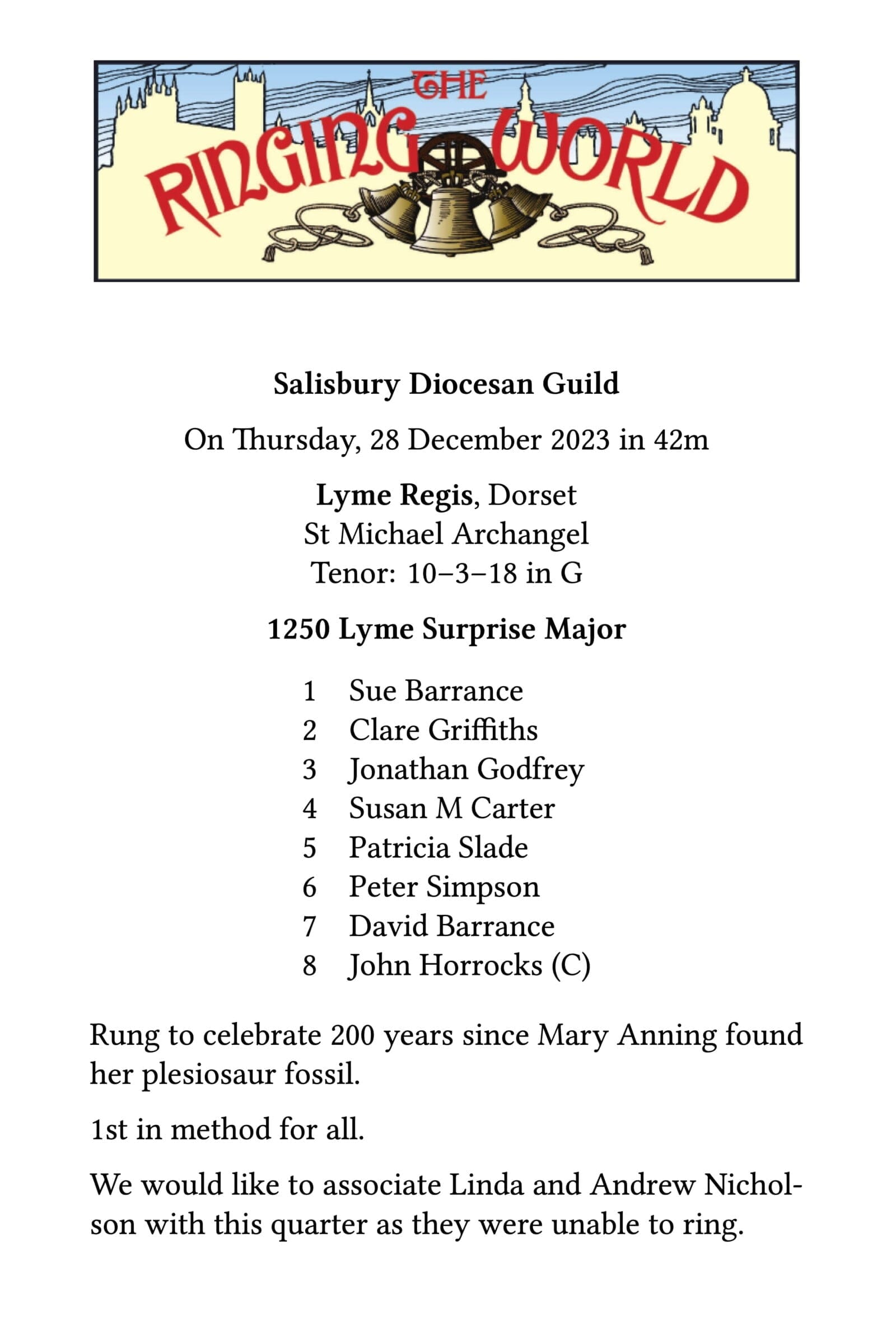 To commemorate the bicentenary of this discovery the Lyme Regis ringers rang a quarter peal of Lyme Surprise Major.