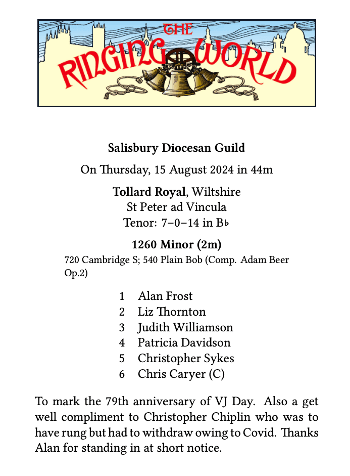 If you follow Ben Maton – the Salisbury Organist – you may have seen his recent video where he was foiled by a quarter peal being rung at Tollard Royal where he was intending to play the organ.