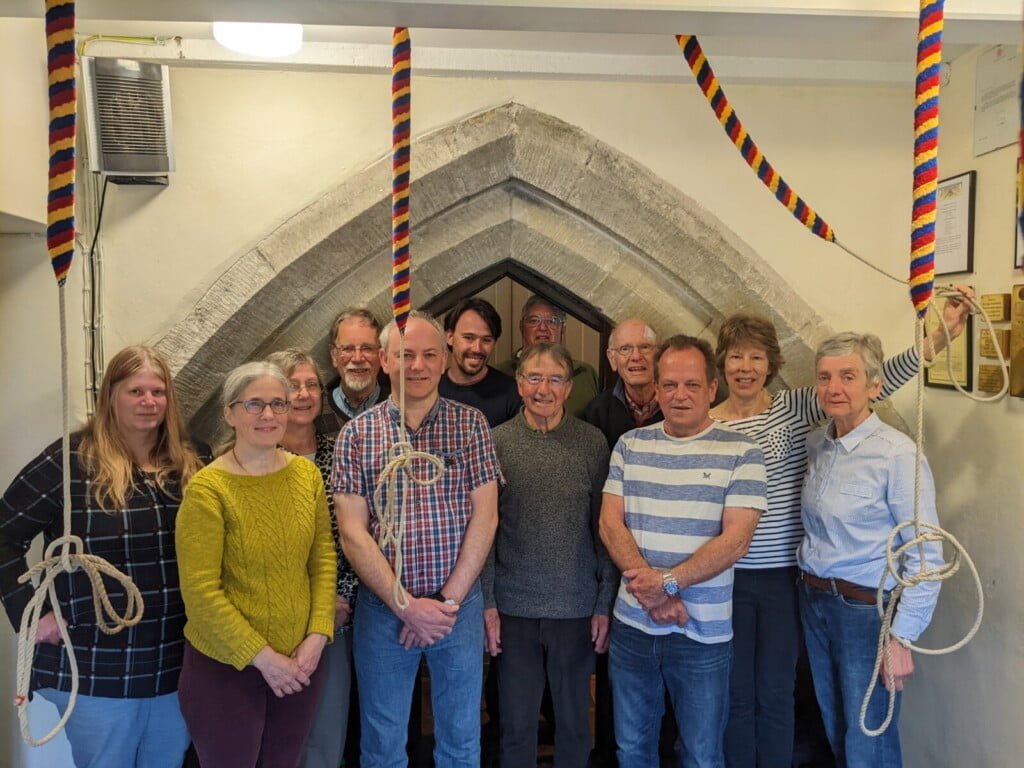The experienced ringers rang a call change sequence of 48 changes that was used at the 1953 Coronation. It was great to be able to do this as it provided a link to our bell ringer predecessors who rang the same thing 70 years before. The whole team – beginners, teachers and experienced ringers – are shown in the photo. One of the home team, Martin Birt, had commemorative mugs produced using this photo which he gave to everybody in the picture.