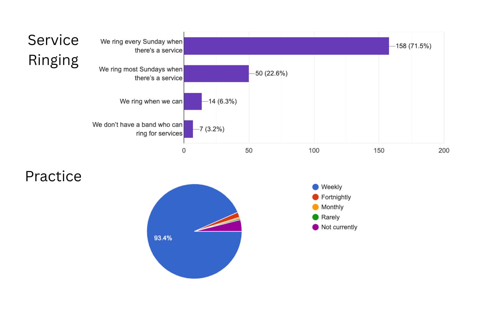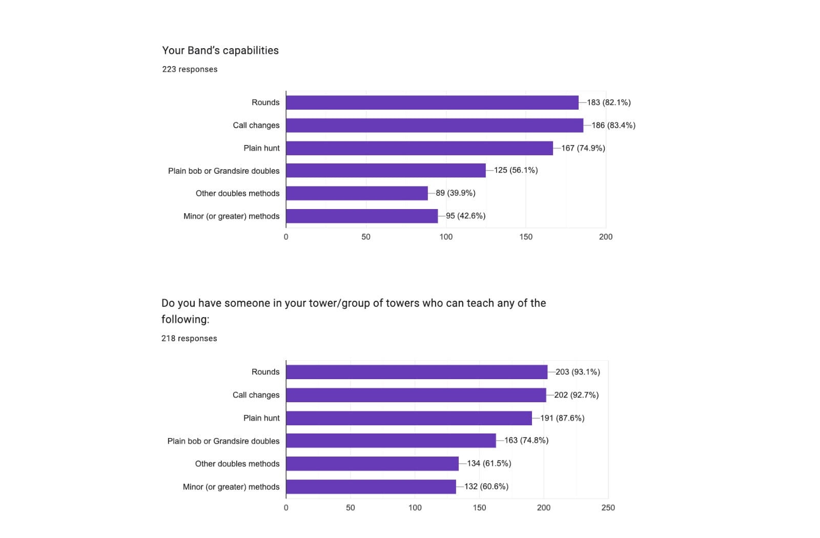The engagement with the survey had been encouraging with a total of 229 responses which represented 120 distinct towers plus several others which were included in multi-parish groupings. The 120 represents 45% of the Guild’s total number of 267 ringable towers (48% of those with 5 or more bells).