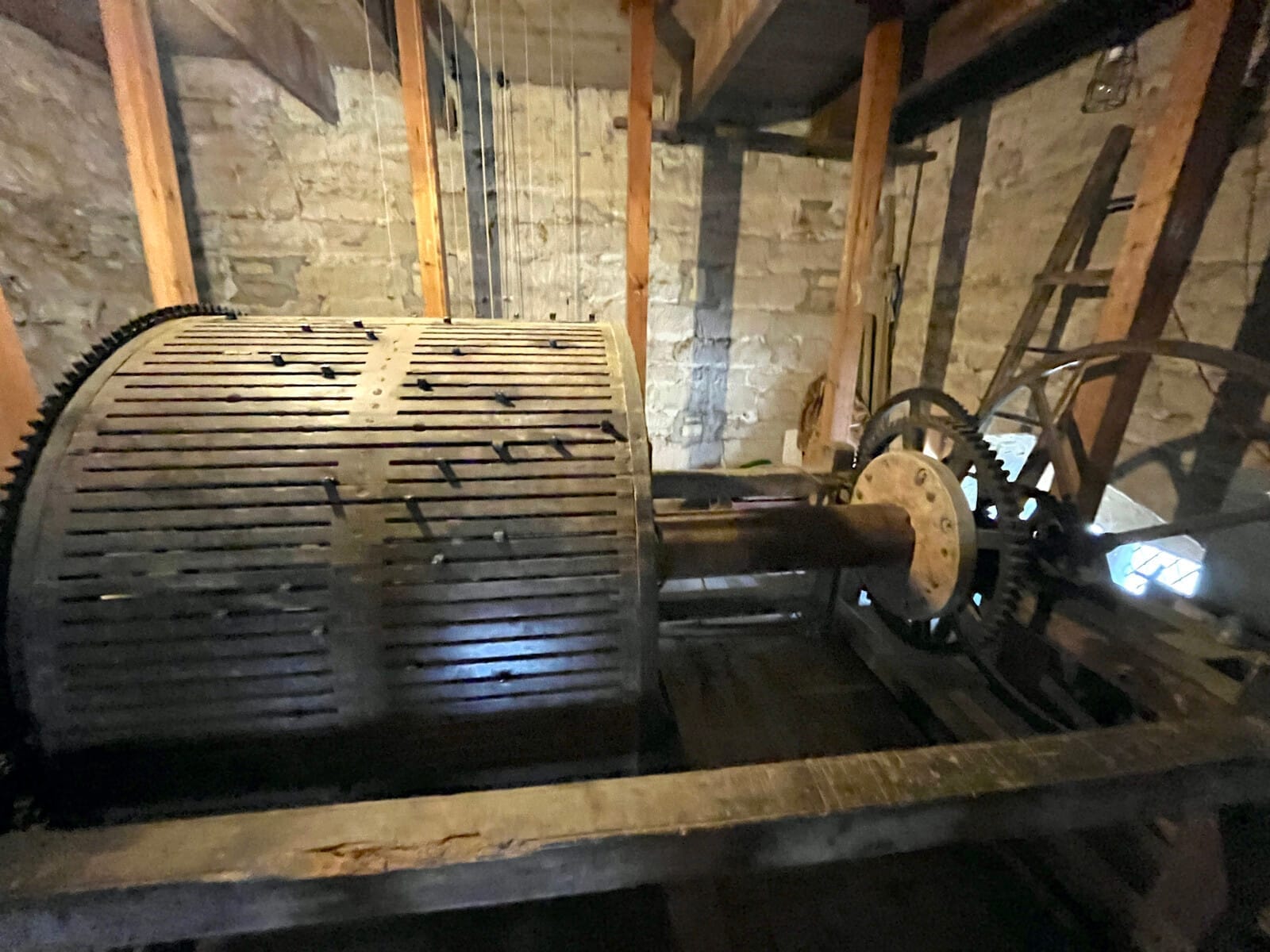 Whilst not something that is seen by most of the ringers at Beaminster, or indeed by visitors, the clock chamber, located between the ringing room and the belfry, contains a fantastic chiming barrel, originally installed in 1767 to play two tunes on the bells through use of hammers. In 1780, this was altered to play one tune – ‘Hannover’ – which it still does every three hours during the day, providing the bells have not been left up. If you visit the ringing chamber at Beaminster, ask to see the chimes!