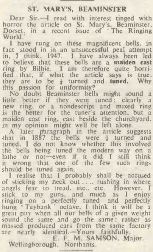 By 1960, an article in The Ringing World lays bare the problems encountered with ringing the bells. The oak frame had been severely weakened by two centuries of wood-boring insect attack and was beginning to rot. A restoration project was launched, with a fundraising target of £4,000. The work would involve, they hoped, rehanging the bells in a new metal frame lower in the tower than the present, replacing all the fittings, and tuning the bells. Not everyone was thrilled with these plans, as only one week later a strongly-worded letter in the Ringing World appeared objecting to the plans to tune them.