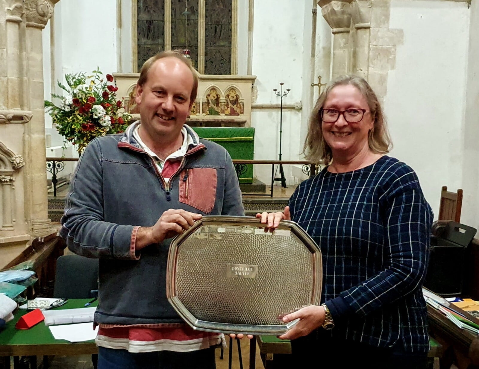 Nick Baker presents the Longridge Silver Salver to Elizabeth Ferguson accepting on behalf of the Shipton Gorge Band
