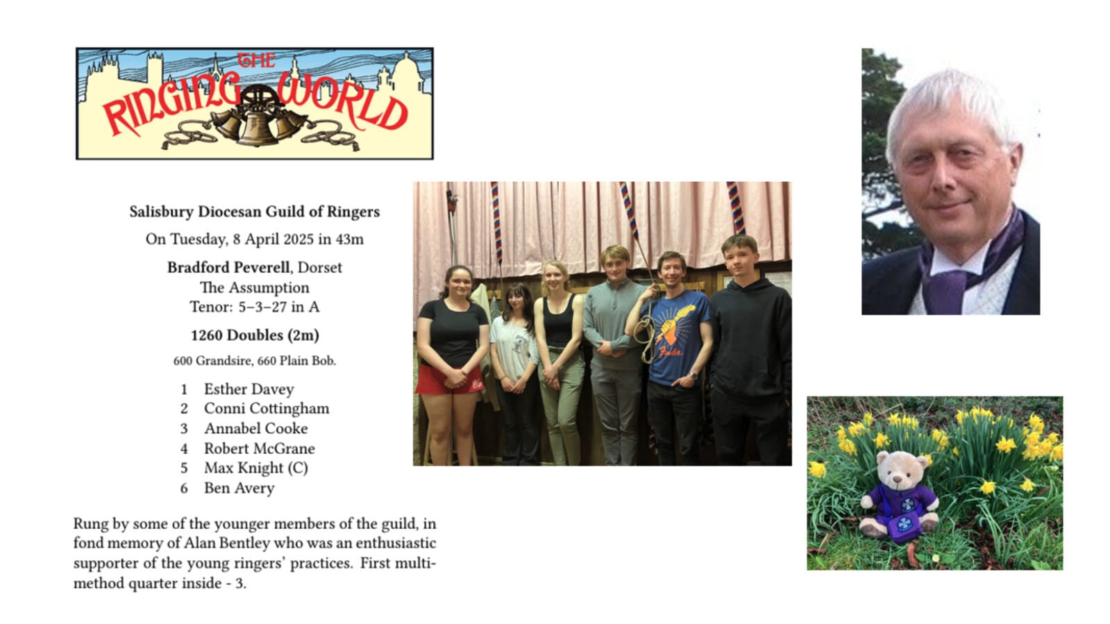 I would like to finish by sharing a recent achievement with you. In the Easter holidays a band comprising some of the younger members of the guild rang a quarter peal in memory of Alan Bentley, who died last summer. Alan was a committed supporter of the young ringers’ practices and we miss him greatly.