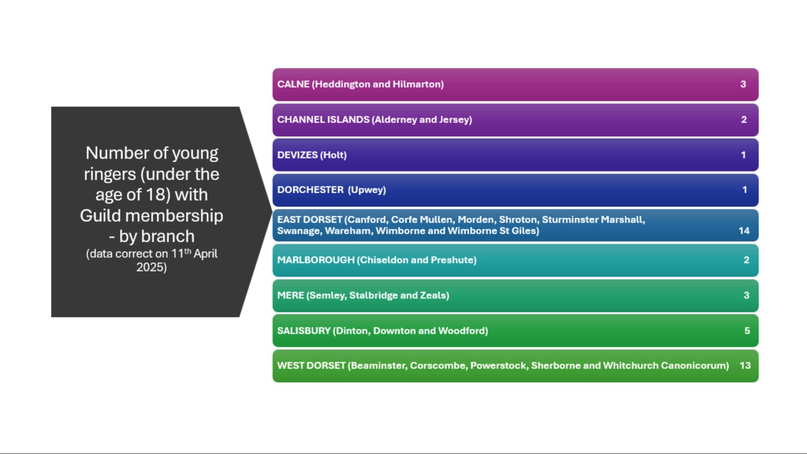 Since last year’s AGM (despite being thwarted by the weather in November and December) we have held nine general practices at towers in the Dorchester, East Dorset, Salisbury and West Dorset branches, plus two more specifically for the RWNYC. Scheduling practices remains a challenge since the young ringers are spread all across the guild and families seem to struggle with committing to dates several weeks in advance.